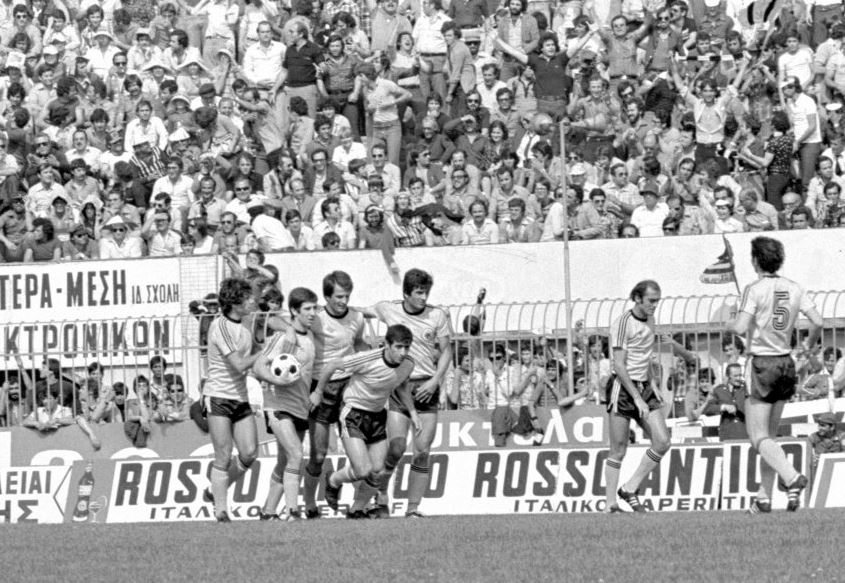 Στις 28 Σεπτεμβρίου 1977 στη Νέα Φιλαδέλφεια οι δυο ομάδες και ο Γιουγκοσλάβος διατητής Τόμε Μανοϊλόφσκι πατούν σε ένα πεντακάθαρο τερέν με απότέλεσμα οι 18.500 θεατές να παρακολουθήσουν έναν κιτρινόμαυρο επιθετικό μονόλογο.