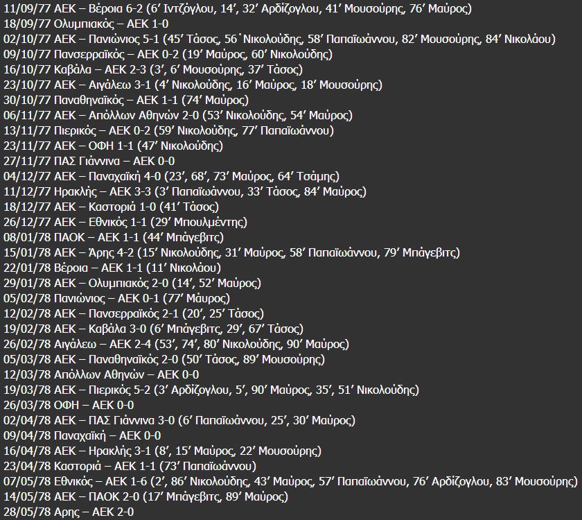 Η ΑΕΚ ξεκινά την περίοδο 1977-78 “μεθυσμένη” από την ανεπανάληπτη Ευρωπαϊκή επιτυχία της συμμετοχής στον Ημιτελικό του Κυπέλλου ΟΥΕΦΑ της προηγούμενης σεζόν και θα την ολοκληρώσει αποθεούμενη, με το ένα από τα δύο συνολικά Ντάμπλ της Ιστορίας της.