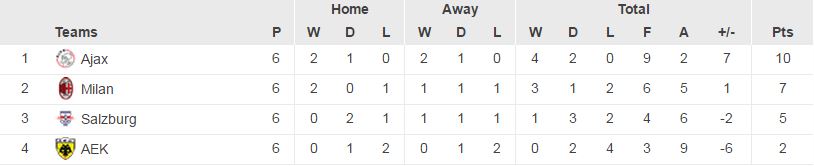 Η πορεία της ΑΕΚ στους ομίλους του Champions League κλείνει με ένα αδιάφορο και…προδιαγεγραμμένο τέλος στο Άμστερνταμ, απέναντι σε έναν Άγιαξ που έκλεισε αήττητος τον όμιλο (και αργότερα κατέκτησε και το τρόπαιο απέναντι στη δεύτερη του ομίλου Μίλαν, γεγονός που αποδεικνύει και την τρομερή δυσκολία του ομίλου της ΑΕΚ) δεχόμενος μόλις 2 τέρματα. Το παιχνίδι -απουσία και Μανωλά- τελείωσε πάρα πολύ νωρίς, μόλις στο 8ο λεπτό όταν ο Ουλιντά πλάσαρε υποδειγματικά τον Ατματσίδη και έβαλε τον Άγιαξ μπροστά στο σκορ. Ακολούθησε ένας μονόλογος των Ολλανδών με πολλές χαμένες ευκαιρίες και μαθήματα ποδοσφαίρου. Το δεύτερο γκολ ήλθε 12 λεπτά πριν το τέλος της αναμέτρης, χωρίς η ΑΕΚ να γίνει απειλητική στο προηγούμενο διάστημα. Σε πανηγυρική ατμόσφαιρα, ο Άγιαξ γιορτάζει την πρώτη θέση στον όμιλο και η ΑΕΚ αποχαιρετά την Ευρώπη τερματίζοντας στην τελευταία θέση, χαλώντας την καλή της εικόνα και τα πολύ θετικά σχόλια που απέσπασε μέχρι την 4η αγωνιστική.
