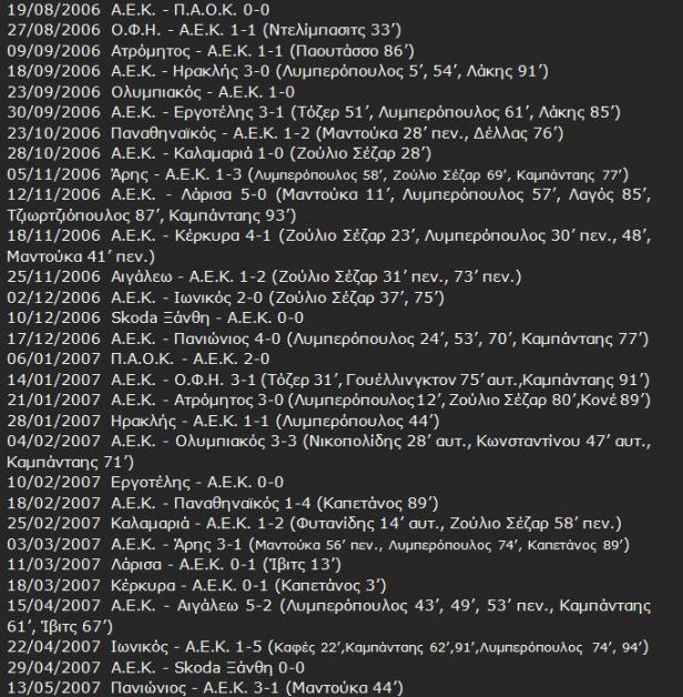 Μεγαλύτερες νίκες της σεζόν είχαμε στα παιχνίδια ΑΕΚ-Λάρισα 5-0, ΑΕΚ-Πανιώνιος 4-0, Ιωνικός-ΑΕΚ 1-5. Σημαντική νίκη σε ντέρμπυ, στο ΠΑΟ-ΑΕΚ 1-2. Στον αντίποδα κάκιστο ματς έκανε η “Ένωση” στο ντέρμπυ του δευτέρου γύρου με τον Παναθηναικό (ΑΕΚ-ΠΑΟ 1-4).