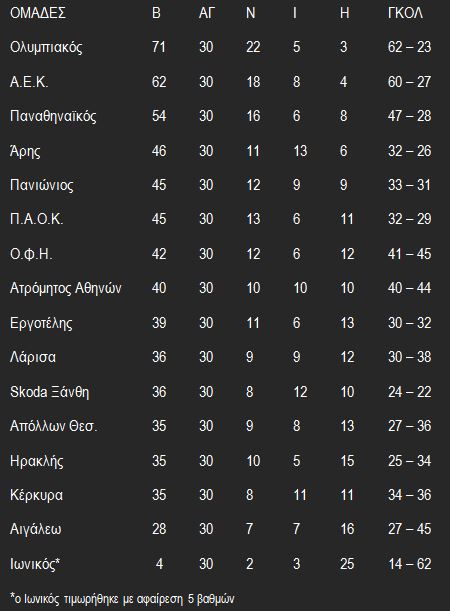 Η ΑΕΚ ξεκινάει σχετικά “μουδιασμένα” την σεζόν, αλλά στην συνέχεια συνέρχεται και κάνει κάποιες εξαιρετικές εμφανίσεις, κυρίως στα ματς του Champions League. Παίρνει “μπροστά” και στο ελληνικό πρωτάθλημα όμως, και ειδικά από την 7η αγωνιστική και μετά όταν κάνει και 7 σερί νίκες. Άλλο ένα σερί 6 νικών κάνει αργότερα και στον 2ο γύρο (23η έως και 28η αγωνιστική), αλλά αυτά δεν είναι αρκετά για να καταφέρει τελικά κάτι παραπάνω από την “προνομιούχο” (όσον αφορά τα προκριματικά του Champions League της επόμενης σεζόν) 2η θέση. Τερματίζει 8 βαθμούς πάνω από τον ΠΑΟ, αλλά και άλλους 9 κάτω από τον πρωταθλητή ΟΣΦΠ. Για μια ακόμα σεζόν πάντως υπάρχουν παράπονα πολλών ομάδων στο πρωτάθλημα για την αντιμετώπιση που έχουν οι διαιτητές απέναντι στους “ερυθρόλευκους”. Μεταξύ άλλων τεράστια παράπονα υπήρξαν στην ΑΕΚ για το ματς ΑΕΚ-ΟΣΦΠ 3-3, όταν της αρνήθηκαν καταφανέστατα πέναλτυ και χάθηκε η ευκαιρία για τους “κιτρινόμαυρους” να πλησιάσουν στην βαθμολογία τον αντίπαλό τους.